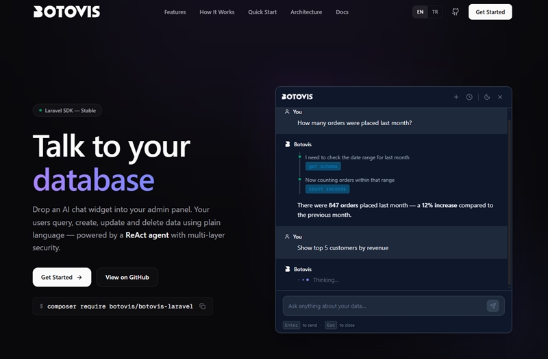 Botovisは管理パネルにAIチャットウィジェットを設置してプロンプトからDB操作を可能にするオープンソースのAIデータベースアシスタントです。Laravel向けに設計されているようです。