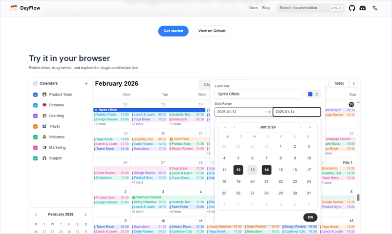 DayFlowは汎用的で使いやすいオープンソースの軽量Reactカレンダーアプリです。シンプルで見やすく、よくあるカレンダーアプリと同様のUX/UIで動作も軽量となっています。