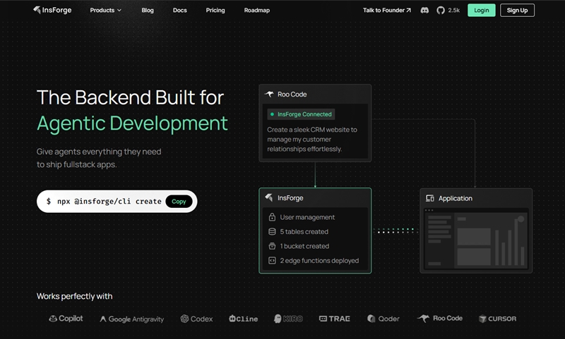 AIエージェントとバックエンドの間のセマンティックレイヤーとして機能する、というもの。AIエージェントと接続し、エージェントがバックエンドシステムを理解し、操作、検査できるようにサポートします。例えばAIエージェントに対しCRMのWebサイト構築をコーディング依頼するプロンプトを送信した際、InsForgeを介してユーザー管理システムやデータベース作成、バケットの作成等を工程した上でデプロイまで進めてくれるようになっています。
