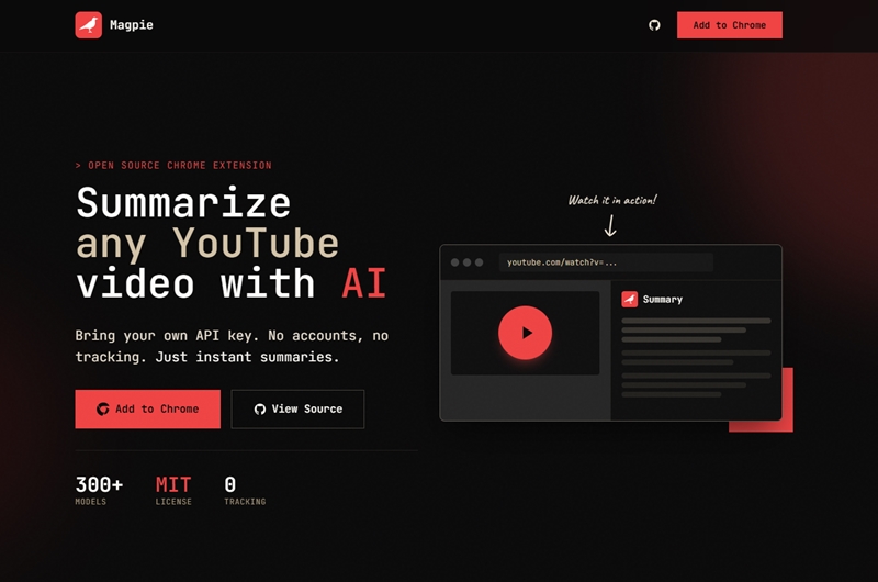 Magpieは視聴中のYoutube動画を、その場でAIが要約、チャットで質問もできるオープンソースのブラウザ拡張です。