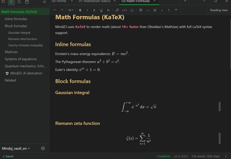 ショトカで切り替え出来るプレビュー、ソース、リーディングの3モードを搭載、数式や図表もサポートしたリッチエディター、高速全文検索、バージョン履歴の自動生成、CLIサポート、多言語化、Tauriベースでクロスプラットフォーム対応(Windows、MacOS、Linux)などを特徴としています。