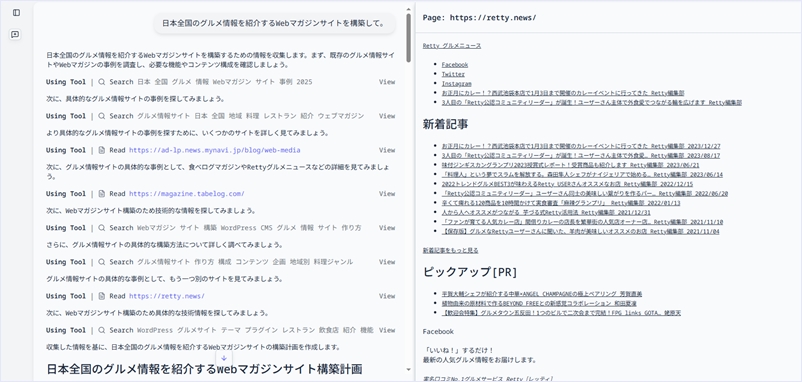 ユーザーからのプロンプトを元にWebで検索を行い、最適なWebサイトのコンテンツをクロールしてデータを収集、新たなタスクを生成して、更に検索を、というプロセスを繰り返して最適な回答を作成します。