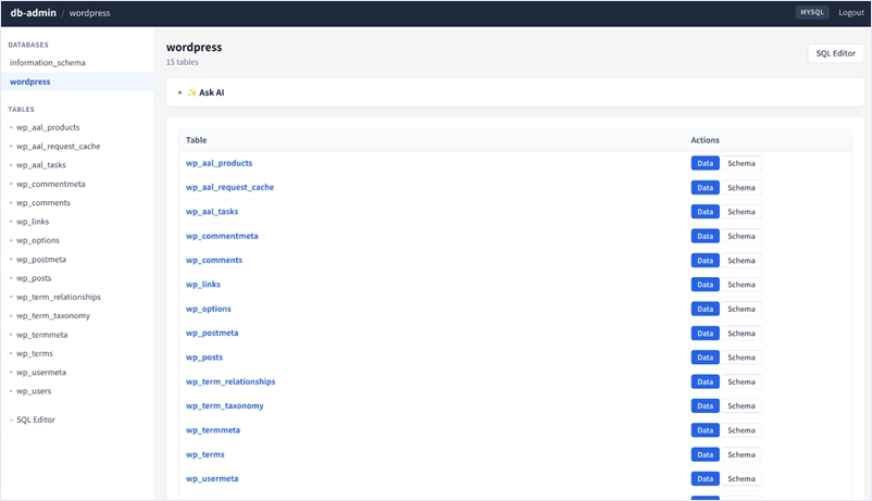 マルチデータベース対応で軽量、左にテーブルツリー/右にテーブル詳細表示をするレイアウトでphpMyAdminやAdminarライクに使えるDB管理ダッシュボードとして提供されています。
