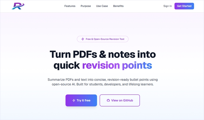 Reviselytは文章量の多いPDFなどのドキュメントをAIで要約して5~10程度に箇条書きしてくれるAI学習サポートツールです。Next.js及びSupabaseで構築されています。