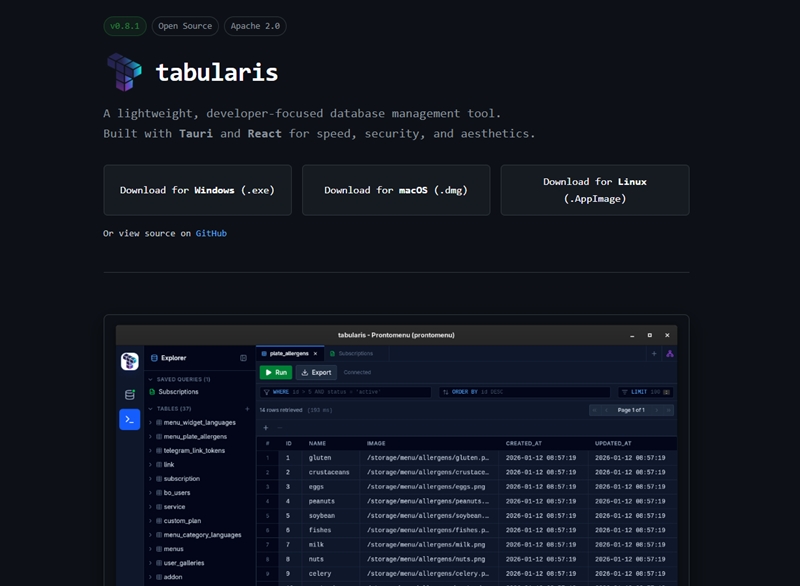 tabularisは軽量、セキュア、使いやすさを重視したオープンソースのデータベース管理ツールです。 TauriとReactで構築されており、Win、MacOS、Linuxなどクロスプラットフォームに対応しています。