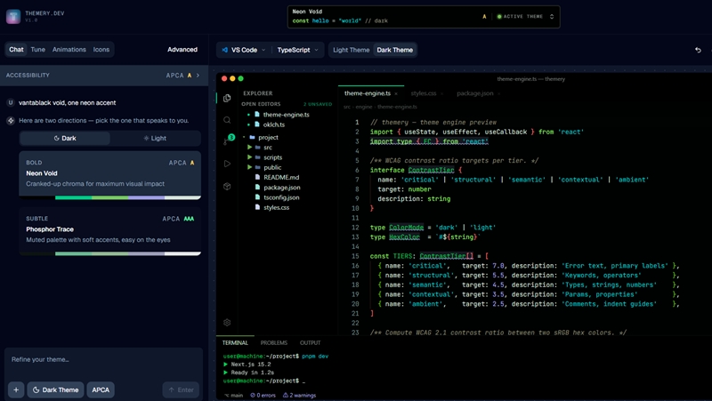 ThemeryはIDEのテーマをデザインできるAI機能付きテーマビルダーです。VS Codeは無料、それ以外のCursor、JetBrains、Zedなど他にも多くのIDEをサポートしていますがこちらは有償で開放されるようになっています。(5USDほど。サブスクでは無さそう)