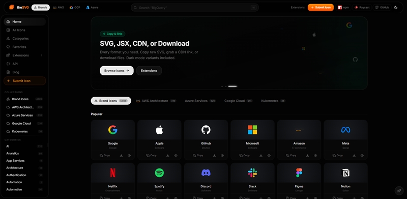 theSVGは5000以上の様々なブランドのロゴをSVGで公開、各フレームワークもサポートしたブランドロゴ検索アプリです。ブランドに加えてAWS、Azure、Google Cloudなどのアーキテクチャアイコンも用意されています。