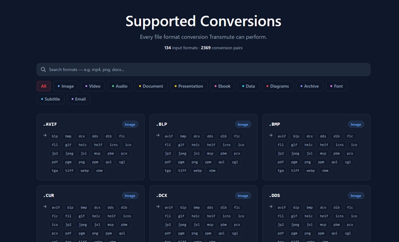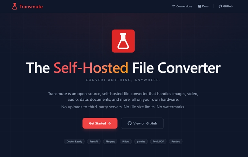 Transmuteはその役割を担うもので、OSSでありファイルサイズも無制限、ウォーターマークも付かず、非常に多数のフォーマットをサポートしたオンラインのファイルコンバーターで、ブラウザで高速に動作します。サードパーティ製へのアップロードもないとの事。準備が整えば数秒でDockerにデプロイできるそうです。