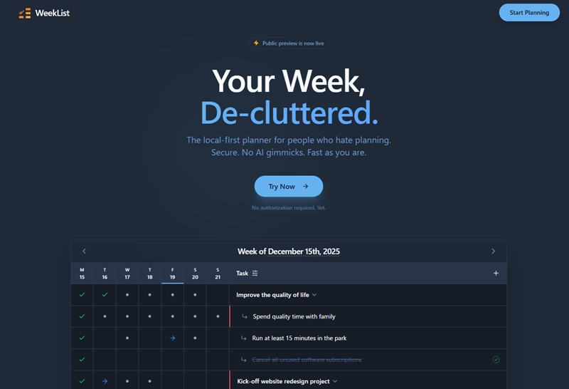 WeekListは1週間のタスクをパッと見でざっくり把握できるオープンソースのウィークリータスクマネージャーです。Next.js、Tailwind、shadcn/uiで構成、Google Antigravityで開発したそうです。