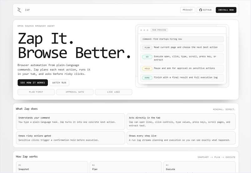 ZapはPlasmo Framework + Next.jsで構築されたAIエージェントによるオープンソースのブラウザ自動化エクステンションです。現在の所はChromeの拡張の実の提供となっています。